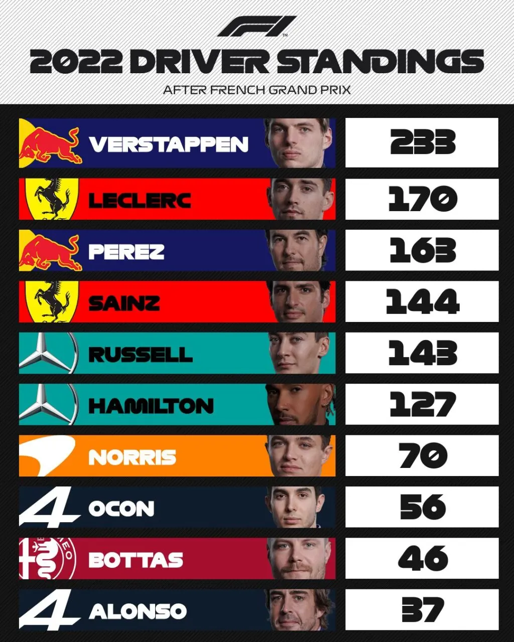 Η κατάσταση στις θέσεις της Formula 1 συνεχώς αλλάζει, με κάθε αγώνα να έχει τη δυνατότητα να ανατρέψει τις ισορροπίες. Όλοι οι ενδιαφερόμενοι θα παρακολουθήσουν με αγωνία τις επόμενες κούρσες, καθώς η μάχη για το πρωτάθλημα είναι ακόμα ανοιχτή. Συνεχίστε να παρακολουθείτε τις εξελίξεις, καθώς η στοίβαξη των οδηγών και οι στρατηγικές των ομάδων θα είναι καθοριστικής σημασίας για την πορεία της σεζόν.